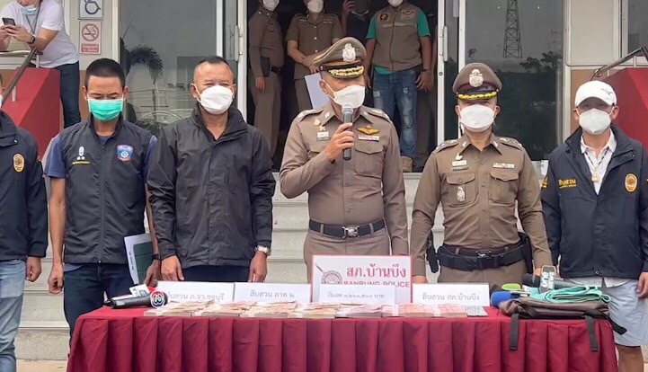 พล.ต.ต.อิทธิพร โพธิ์ทอง รองผู้บัญชาการตำรวจภูธรภาค 2 พ.ต.อ.ทวี กุดแถลง ผู้กำกับการสถานีตำรวจภูธรบ้านบึง ร่วมกันแถลงข่าวการจับกุมตัวผู้ต้องหาร่วมก่อเหตุชิงทรัพย์ โดยใช้ยานพาหนะเพื่อการกระทำความผิดหรือพาทรัพย์นั้นไป หรือเพื่อให้พ้นการจับกุม และเป็นเหตุให้ผู้อื่นได้รับอันตรายแก่กายหรือจิตใจ ประกอบด้วย นายจตุพล อายุ 27 ปี และนางสาวประภาภรณ์ อายุ 29 ปี พร้อมด้วยของกลางเป็นเงินสดจำนวน 3,263,500 บาท