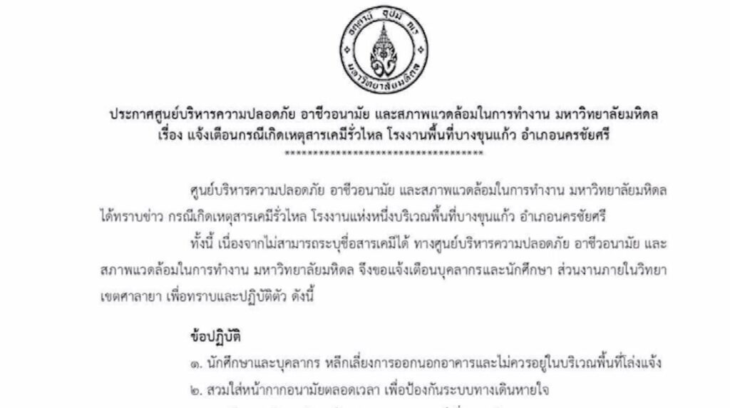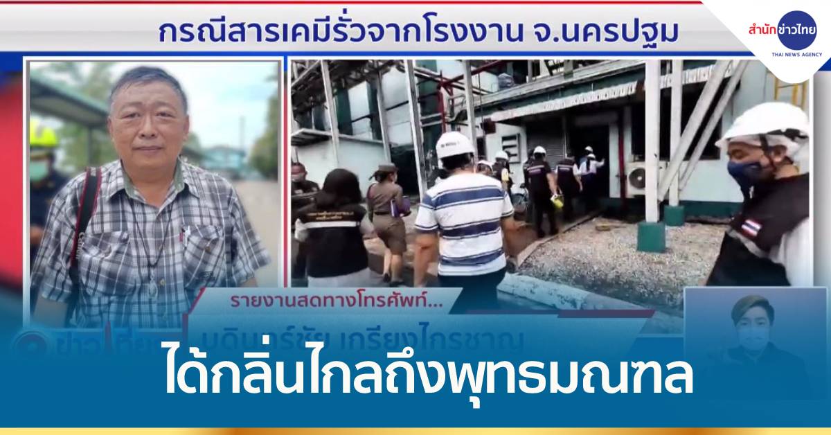 นครปฐม 22 ก.ย. –ผู้ว่าฯ นครปฐม รุดตรวจโรงงานที่เกิดเหตุสารเคมีรั่ว กลิ่นคลุ้งกระจายเป็นวงกว้าง ไปไกลถึงพุทธมณฑล เจ้าหน้าที่ยืนยันกลิ่นสารเคมีที่ลอยไปไม่อันตราย แต่อาจทำให้ระคายเคืองตา