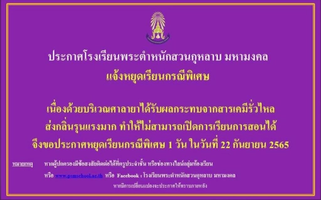 ขณะที่โรงเรียนอย่างน้อย 2 แห่ง คือ โรงเรียนสาธิตนานาชาติ ม.มหิดล และโรงเรียนพระตำหนักสวนกุหลาบ มหามงคล แจ้งหยุดเรียนกรณีพิเศษ 1 วัน . – สำนักข่าวไทย