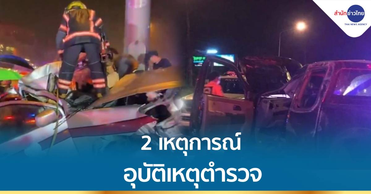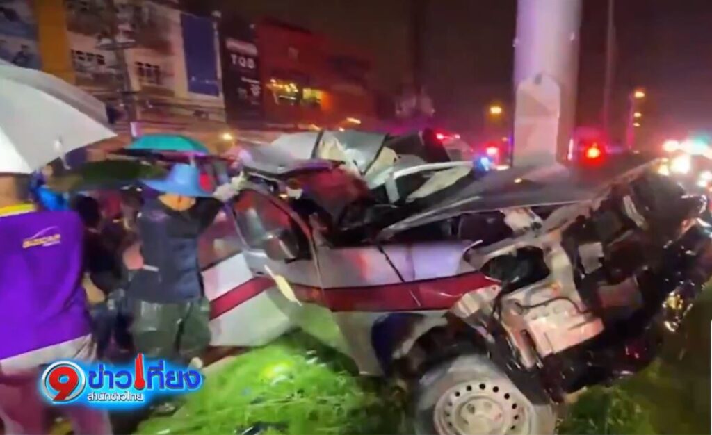 สายตรวจขับรถฝ่าฝนพุ่งชนเสาไฟส่องสว่าง ตาย 1 สาหัส 2 นาย