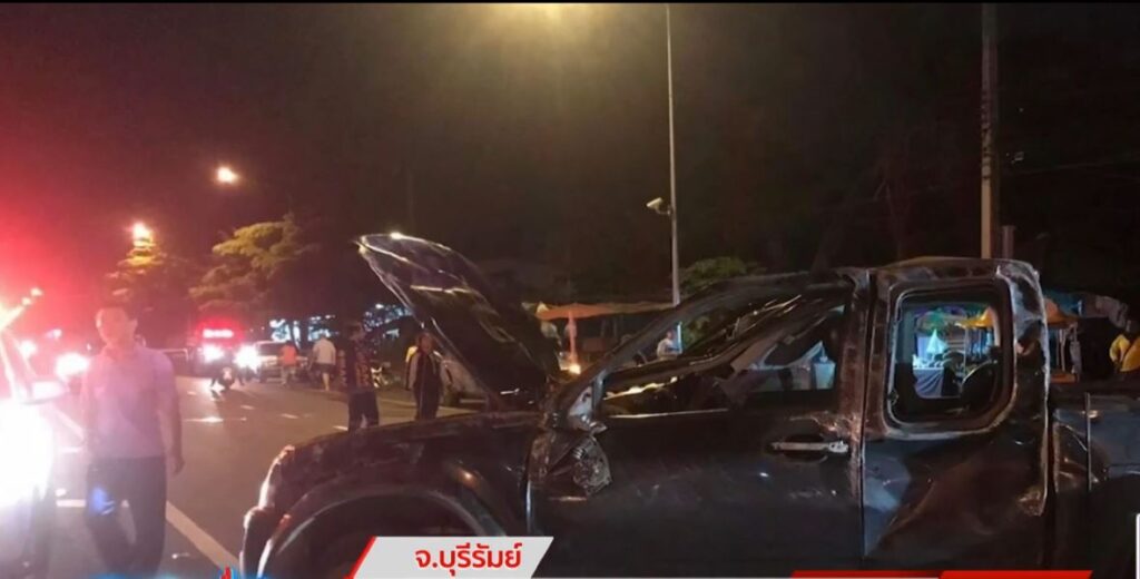 นี่คือภาพจากกล้องวงจรปิดที่สามารถจับภาพขณะ ร.ต.ต.สุทิน อายุ 55 ปี รองสารวัตรกองกำกับการสืบสวนสอบสวนภูธรจังหวัดบุรีรัมย์ ขับรถกระบะ พุ่งชนรถจักรยานยนต์ของนายอัมรินทร์ อายุ 25 ปี ที่จอดรอเลี้ยว เสียชีวิต ก่อนไถลข้ามเลนไปพุ่งชนรถจักรยานยนต์อีก 3 คัน ทำให้มีผู้ได้รับบาดเจ็บสาหัส 3 คน โดย 2 ใน 3 เป็นอาสากู้ภัยตำรวจทางหลวงบุรีรัมย์ เหตุเกิดบนถนนสายนางรอง-ชำนิ ก่อนถึงแยกศูนย์ไหมนางรอง อ.นางรอง
