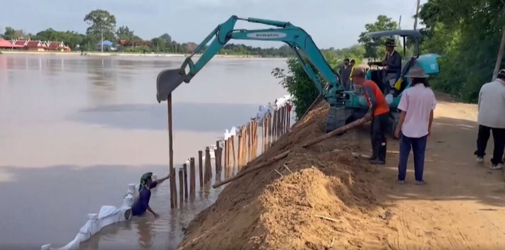 เจ้าหน้าที่องค์การบริหารส่วนตำบลเทวราช อ.ไชโย จ.อ่างทอง เร่งนำรถแบ็กโฮและเสาเข็มไม้สนหลายร้อยต้นสร้างแนวป้องกันตลิ่งทรุดตัวยาวกว่า 300 เมตร ปักแนวบริเวณตลิ่งริมแม่น้ำเจ้าพระยา ซึ่งอยู่ระหว่างการก่อสร้างเขื่อนเรียงหิน เพื่อป้องกันคันดินเกิดการทรุดตัว และน้ำจะเข้าท่วมบ้านเรือนประชาชน จากระดับน้ำที่คาดว่าจะเพิ่มสูงขึ้นอย่างต่อเนื่อง ขณะที่มีรายงานว่าน้ำเข้าท่วมบ้านเรือนประชาชนในพื้นที่ลุ่มต่ำนอกแนวคันกั้นน้ำแล้วหลายตำบล ซึ่งทางจังหวัดเตรียมความพร้อมในการรับมือและแจ้งเตือนประชาชนในพื้นที่เฝ้าติดตามสถานการณ์น้ำอย่างใกล้ชิด.-สำนักข่าวไทย
