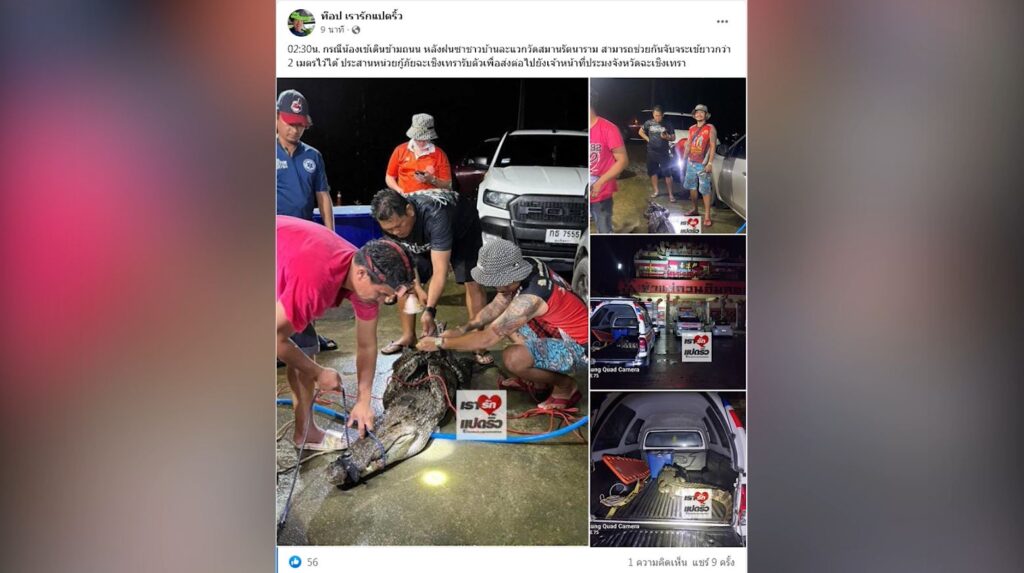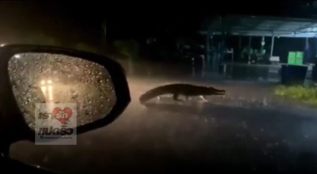 หนุ่มขับรถฝ่าสายฝนมองไกลๆ นึกว่า “ตัวเงินตัวทอง” ข้ามถนน แต่พอมาใกล้ๆ ลมแทบจับ เป็นจระเข้ตัวใหญ่ โดยเหตุการณ์นี้เกิดขึ้นกลางดึกที่ผ่านมา ชาวบ้านขับรถผ่านแพกุ้ง ในเส้นทางมุ่งหน้าไปวัดสมานรัตนาราม ต.คลองจุกเฌอ อ.เมืองฉะเชิงเทรา