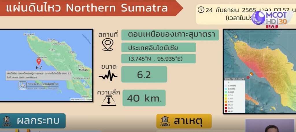 ภาคใต้ 24 ก.ย. – เกิดแผ่นดินไหวขนาด 6.2 บริเวณตอนเหนือของหมู่เกาะสุมาตรา อินโดนีเซีย รับรู้ได้ถึงสงขลา พังงา ภูเก็ต แต่ยังไม่มีรายงานความเสียหาย ด้าน ปภ. สั่งแต่ละพื้นที่ติดตามสถานการณ์อย่างใกล้ชิด