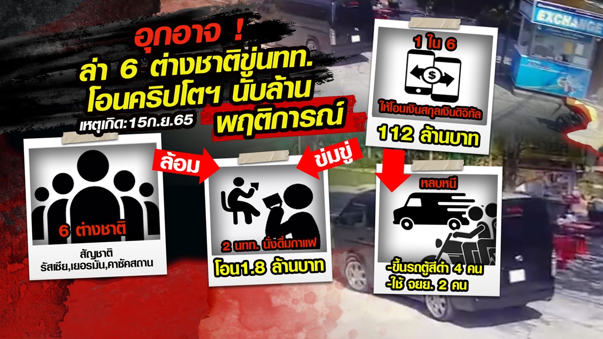 นายเยฟกีนี เล่าว่า ขณะกำลังนั่งดื่มกาแฟอยู่ในร้านดังกล่าว มีกลุ่มชายฉกรรจ์ชาวรัสเซีย เยอรมัน และคาซัคสถาน จำนวน 6 คน เข้ามาล้อม โดย 1 ใน 6 ชายฉกรรจ์ ทราบต่อมาว่าชื่อ นายซาลมาน อัลมาตี ชาวเยอรมัน ได้เข้ามาตีสนิท อ้างว่าเคยพบกับตนเองที่ประเทศรัสเซีย พร้อมทั้งข่มขู่ให้โอนเงินสกุลเงินดิจิทัล หรือ คริปโทเคอร์เรนซี จำนวน 3 ล้านดอลลาร์ฯ คิดเป็นเงินไทย 112 ล้านบาท แต่ตนเองมีสกุลเงินคริปโทเคอร์เรนซีอยู่เพียง 58,000 ดอลลาร์ฯ คิดเป็นเงินไทย 2.1 ล้านบาท การข่มขู่ดังกล่าวทำให้ตนเองหวาดกลัวว่าจะถูกทำร้ายร่างกาย จึงโอนเงินคริปโทเคอร์เรนซี จำนวน 50.000 ดอลลาร์ฯ คิดเป็นเงินไทย 1.8 ล้านบาท