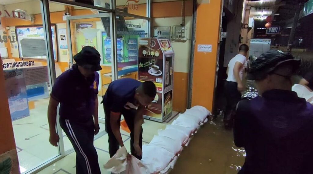 ขณะที่ในตัวเมืองศรีสะเกษ น้ำจากลำห้วยสำราญเอ่อล้นขึ้นมาท่วมถนน และบ้านเรือนประชาชนทั้งหมด 10 ชุมชน จนต้องอพยพขึ้นไปอยู่บนที่สูง ส่วนที่สถานีขนส่งผู้โดยสาร บขส.กันทรลักษ์ น้ำท่วมขังเต็มพื้นที่ เจ้าหน้าที่จากหน่วยเฉพาะกิจกรมทหารพรานที่ 23 จัดกำลังเข้าช่วยเหลือ โดยนำกระสอบทรายเสริมแนวกั้นน้ำ เพื่อบรรเทาไม่ให้น้ำเข้าไปยังสำนักงานบริษัทขนส่ง ขณะที่ปริมาณน้ำเพิ่มสูงขึ้นเรื่อยๆ. – สำนักข่าวไทย