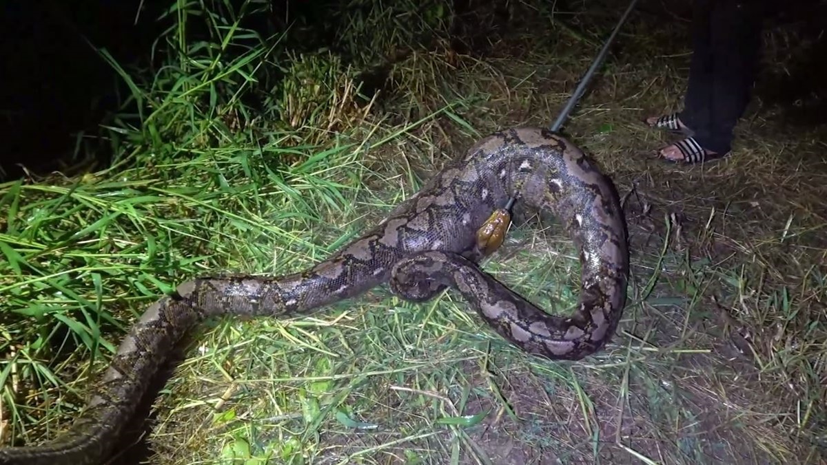 เมื่อไปถึงเป็นช่วงที่ฝนกำลังตก นายเนตรนรินทร์ ได้พากู้ภัยเดินเข้าไปบริเวณข้างบ่อ ซึ่งเป็นพงหญ้า พบงูเหลือมขนาดใหญ่นอนหลบอยู่ และพบว่าบริเวณท้องของมันมีขนาดใหญ่มาก จนทำให้มันเลื้อยไปไหนไม่ได้ จากนั้นกู้ภัยได้ใช้บ่วงเชือกคล้องคองู แล้วนำขึ้นรถ เพื่อปล่อยคืนสู่ธรรมชาติ