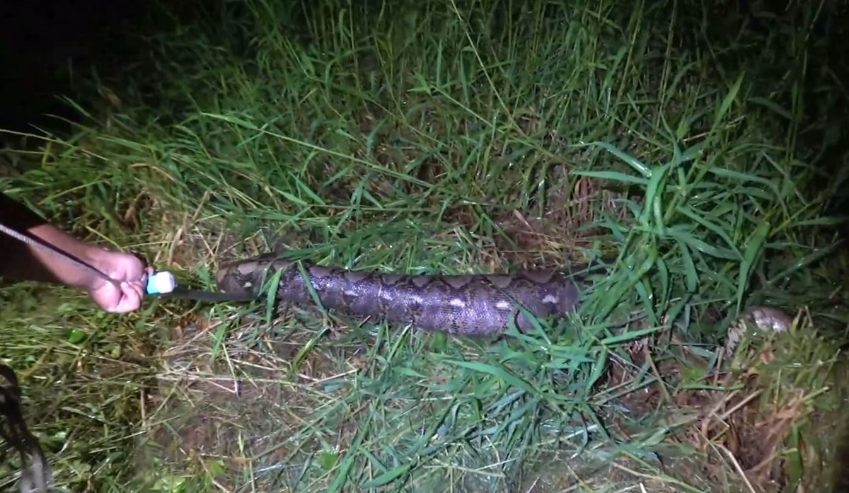 นายเนตรนรินทร์ เผยว่า เมื่อวานนี้ (28 ก.ย.) ขณะที่ตนตัดหญ้า ก็เกือบไปโดนงูเหลือมตัวดังกล่าวที่นอนอยู่ในพงหญ้า ซึ่งมีลำตัวขนาดใหญ่ ทีแรกคิดว่าเดี๋ยวมันจะเลื้อยไปเอง แต่วันนี้มาก็ยังอยู่ และคิดว่าน่าจะกินสุนัขขนาดใหญ่เข้าไป จึงทำให้มันเลื้อยไปต่อไม่ได้ สุดท้ายก็ต้องเรียกกู้ภัยมาช่วยจับ. – สำนักข่าวไทย