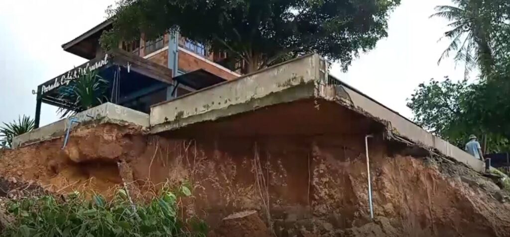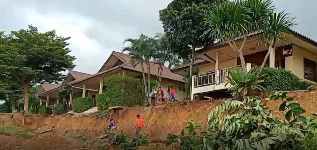 อุบลราชธานี 29 ก.ย. – อิทธิพลพายุโนรู ส่งผลให้ดินบริเวณหน้าห้องพักของรีสอร์ต จ.อุบลราชธานี สไลด์เป็นทางยาว 100 เมตร ฝ่ายปกครองสั่งปิด พร้อมตรวจสอบ หวั่นรีสอร์ตพังลงในแม่น้ำ