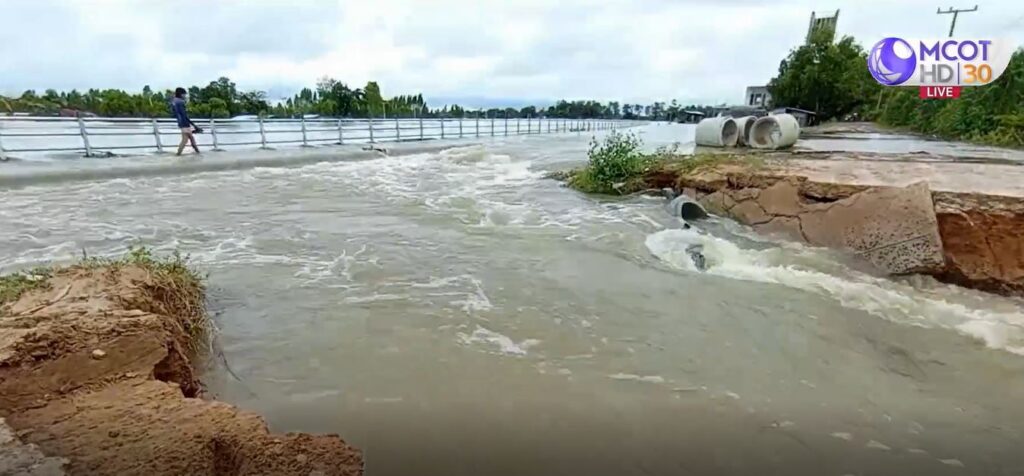 พนังกั้นน้ำบริเวณประตูเปิด-ปิดระบายน้ำบ้านโพธิ์ ต.โพธิ์ อ.เมือง จ.ศรีสะเกษ ทนมวลน้ำไม่ไหว พังลงมายาวกว่า 10 เมตร ส่งผลให้มวลน้ำจำนวนมากทะลักท่วมพื้นที่การเกษตร และไหลเข้า อ.กันทรารมย์
