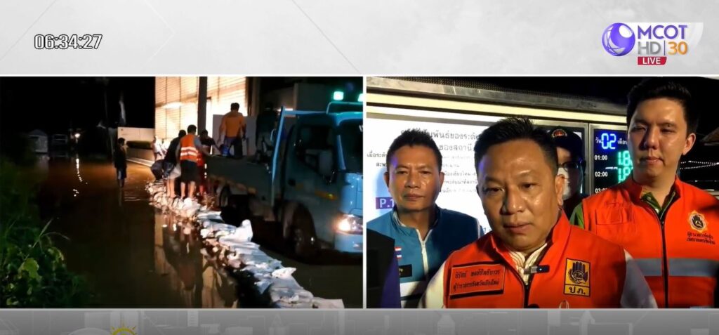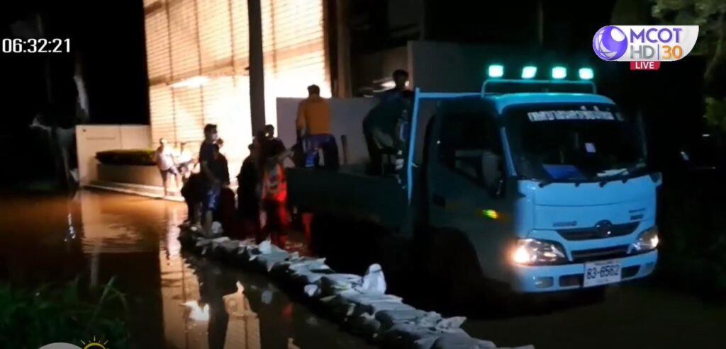 เจ้าหน้าที่เร่งวางกระสอบทรายทำแนวป้องกันตลิ่งริมสองฝั่งแม่น้ำปิงที่ไหลผ่านตัวเมืองเชียงใหม่ ซึ่งปัจจุบันมีมวลน้ำเพิ่มสูงขึ้นอย่างต่อเนื่องจากฝนที่ตกหนัก ในอำเภอทางตอนเหนือ ทำให้มีน้ำป่าไหลหลากสะสมลงลำน้ำปิง