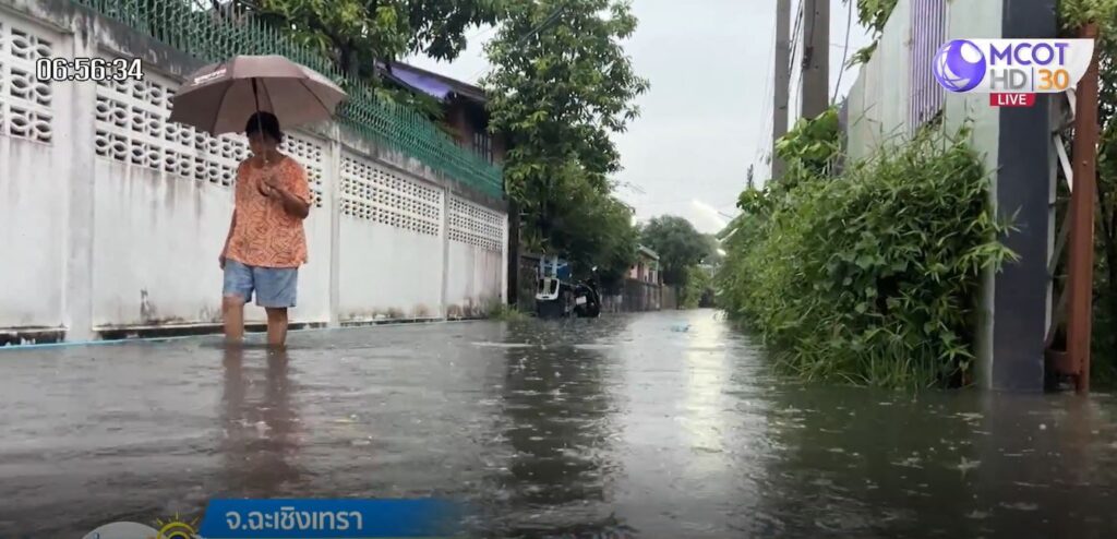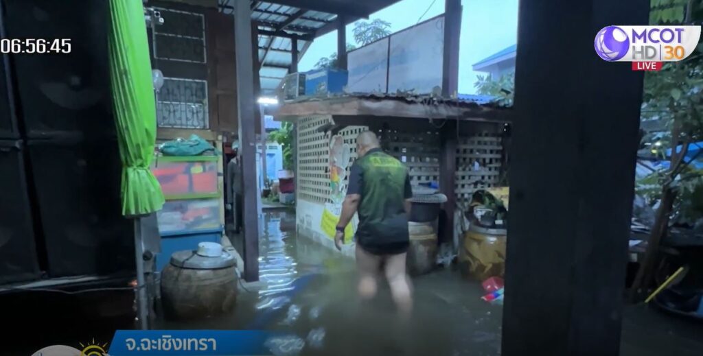 ฉะเชิงเทรา 4 ต.ค. – ฝนตกต่อเนื่องทั่วเมืองแปดริ้ว จ.ฉะเชิงเทรา ประกอบน้ำทะเลหนุนสูงในแม่น้ำบางปะกง ส่งผลถนนหลายสายมีน้ำท่วมขัง บางจุดสูง 40 ซม. ไหลท่วมบ้านเรือน ขณะที่เทศบาลเร่งระบายน้ำออกจากท่อลงสู่แม่น้ำบางปะกง