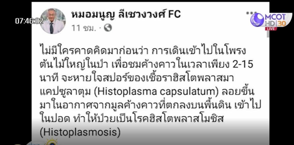จากกรณีนายแพทย์มนูญ ลีเชวงวงศ์ แพทย์เฉพาะทางด้านโรคระบบการหายใจ โรงพยาบาลวิชัยยุทธ โพสต์เฟซบุ๊กส่วนตัวระบุ “ไม่มีใครคาดคิดมาก่อนว่าการเดินเข้าไปในโพรงต้นไม้ใหญ่ในป่าพื่อชมค้างคาวในเวลาเพียง 2-15 นาที จะหายใจสปอร์ของเชื้อราฮิสโตพลาสมา แคปซูลาตุม (Histoplasma capsulatum) ลอยขึ้นมาในอากาศจากมูลค้างคาวที่ตกลงบนพื้นดิน เข้าไปในปอด ทำให้ป่วยเป็นโรคฮิสโตพลาสโมซิส (Histoplasmosis) เมื่อวันที่ 30 ก.ค. 65 มีคณะเดินทางศึกษาธรรมชาติเข้าไปในโพรงต้นไม้ เท่าที่ทราบ 7 ใน 10 คนของคณะนี้ 2-3 สัปดาห์ หลังเข้าโพรงต้นไม้ บางคนเริ่มป่วย ไอ อ่อนเพลีย เหนื่อยง่าย เอกซเรย์ปอด 7 คน มีจุดขนาดแตกต่างกันกระจายทั่วปอด ไล่ตั้งแต่คนมีจุดเล็กที่สุดในปอดขนาด 3 มิลลิเมตร ไปถึงคนที่มีลักษณะเป็นก้อนขนาด 1 เซนติเมตร กระจายทั่วปอด คนที่มีก้อนในปอดพิสูจน์แล้วว่า เป็นโรคฮิสโตพลาสโมซิส ด้วยการตัดชิ้นเนื้อจากปอดพบเชื้อรา Histoplasma capsulatum เจริญเติบโตแบ่งตัวในปอด