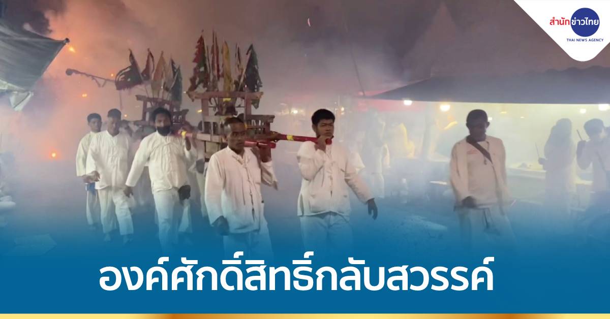เช่นเดียวกับ จ.ภูเก็ต ศาลเจ้าต่าง ๆ ประกอบพิธีส่งพระ ซึ่งมีขบวนแห่พระของแต่ละศาลเจ้าเคลื่อนไปตามถนนสายต่าง ๆ ในตัวเมืองภูเก็ตมุ่งหน้าสู่ปลายแหลมสะพานหิน เพื่อไปประกอบพิธีส่งองค์เทพเจ้าสูงสุดของการถือศีลกินผักกลับสู่สรวงสวรรค์ ท่ามกลางสายฝนที่ตกลงมาตลอดเวลา แต่ไม่เป็นอุปสรรคในการประกอบพิธี โดยมีประชาชนและนักท่องเที่ยวทั้งชาวไทยและชาวต่างชาติมาร่วมพิธีจำนวนมาก ตลอดทางมีการจุดประทัดอย่างต่อเนื่อง ขณะที่หน้าอาคารบ้านเรือนและสำนักงานต่างๆ มีการตั้งโต๊ะบูชาและรับองค์พระ เพื่อความเป็นสิริมงคล สำหรับการจัดงานประเพณีถือศีลกินผักของจังหวัดภูเก็ตปีหน้า กำหนดจัดขึ้นระหว่างวันที่ 15–23 ตุลาคม 2566.-สำนักข่าวไทย