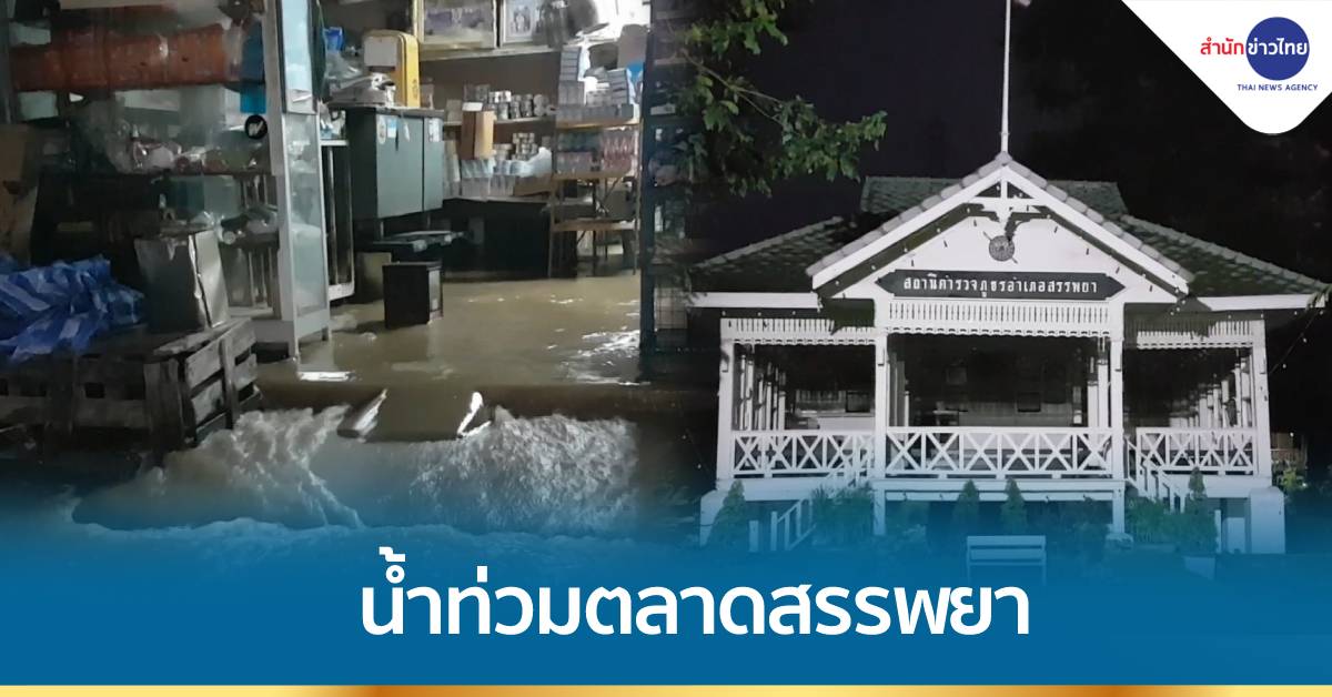 หลังจากเขื่อนเจ้าพระยา จังหวัดชัยนาท ได้เพิ่มระบายน้ำท้ายเขื่อนเกินกว่า 2,700 ลูกบาศก์เมตรต่อวินาที ตั้งแต่บ่ายวานนี้ ทำให้ระดับน้ำในแม่น้ำเจ้าพระยาที่ไหลผ่าน อ.สรรพยา เพิ่มสูงขึ้นต่อเนื่อง ส่งผลให้น้ำท่วมพื้นที่ขยายวงกว้างมากขึ้น โดยเมื่อคืนที่ผ่านมา แม่น้ำเจ้าพระยาได้ลอดใต้พนังกั้นน้ำบริเวณหน้าตลาดสรรพยา ทะลักเข้ามาท่วมอาคารร้านค้า พื้นที่ภายในตลาดไปจนถึงโรงพักเก่า ร.ศ.120 สถานที่ท่องเที่ยวชื่อดังของอำเภอ อาสาสมัครมูลนิธิต้องไปช่วยพ่อค้าแม่ค้าเก็บสินค้าและขนย้ายทรัพย์สินออกไปไว้ในจุดที่พ้นน้ำ ขณะที่หลายหน่วยงานนำกระสอบทรายไปกั้นน้ำและใช้เครื่องสูบน้ำขนาดใหญ่ 3 เครื่อง สูบน้ำออกจากตลาดตลอดทั้งคืน แต่ก็ไม่เป็นผล น้ำยังคงไหลเข้าท่วมในตลาดอย่างต่อเนื่อง.-สำนักข่าวไทย