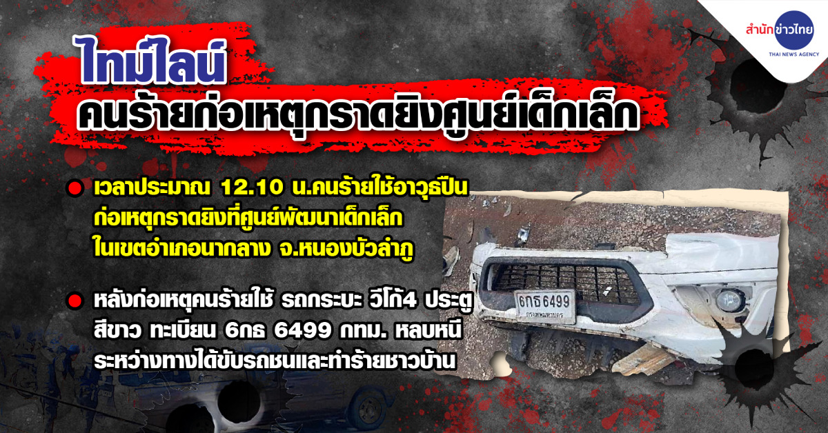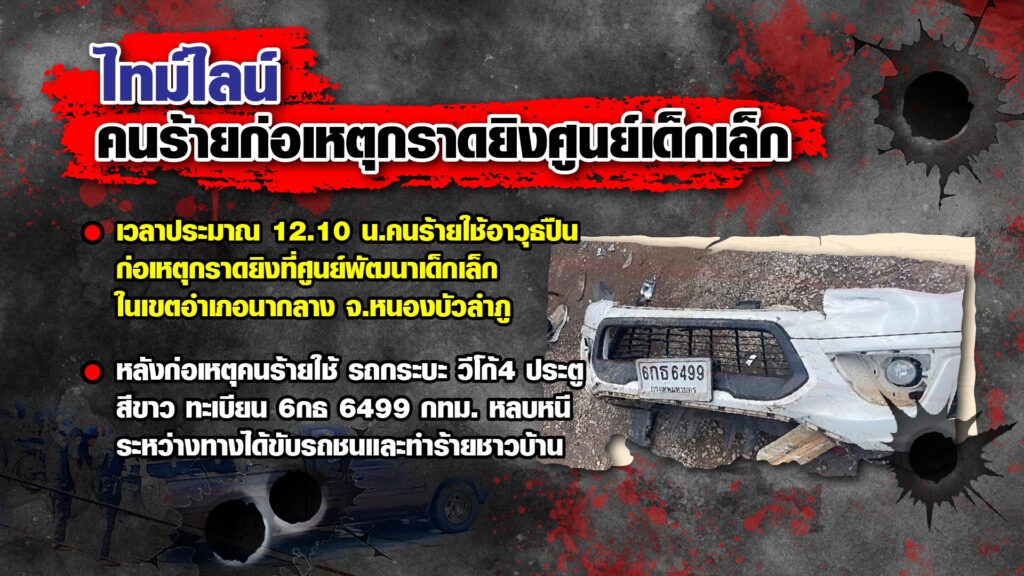 - เวลาประมาณ 12.10 น. คนร้ายเข้ามาใช้ปืนกราดยิงที่ศูนย์พัฒนาเด็กเล็กในเขตอำเภอนากลาง จ.หนองบัวลำภู ก่อนขึ้นรถกระบะ วีโก้ 4 ประตู สีขาว หลบหนี ระหว่างทางได้ขับรถชนและทำร้ายชาวบ้าน