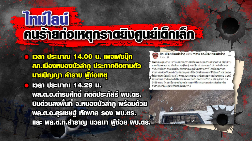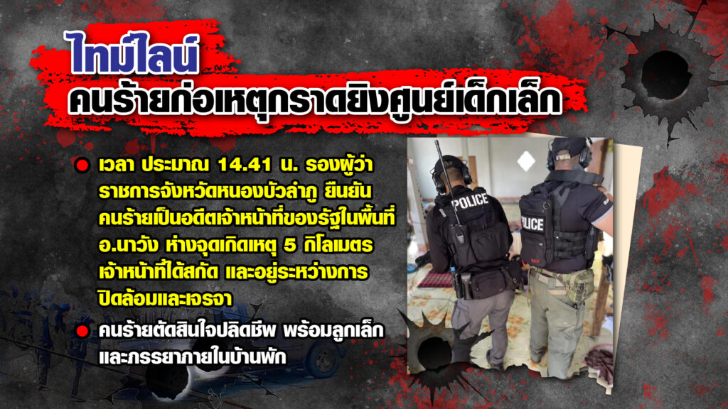 หนองบัวลำภู 6 ต.ค. – เปิดไทม์ไลน์เหตุสะเทือนขวัญ อดีตตำรวจกราดยิงในศูนย์พัฒนาเด็กเล็ก อ.นากลาง จ.หนองบัวลำภู มีผู้เสียชีวิตสูงถึง 38 คน ในจำนวนนี้เป็นเด็กเล็กกว่า 20 คน