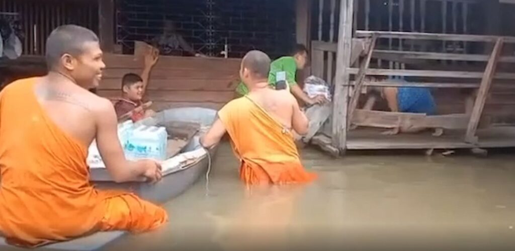พระมาโปรด เจ้าอาวาสลุยน้ำแจกถุงยังชีพชาวบ้าน