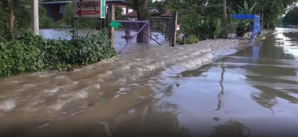 เขื่อนเจ้าพระยา จ.ชัยนาท ระบายน้ำเพิ่มเป็น 3,048 ลูกบาศก์เมตรต่อวินาที ตั้งแต่เมื่อช่วง 1 ทุ่ม เมื่อวานนี้ ทำให้สถานการณ์น้ำท่วมในพื้นที่ อ.สรรพยา ขยายวงกว้างและท่วมสูงมากขึ้น มีน้ำล้นตลิ่งท่วมหมู่บ้านเพิ่มขึ้นหลายจุด เช่น ที่หมู่ 2 ต.ตลุก อ.สรรพยา น้ำล้นตลิ่งไหลข้ามถนน หลากเข้าท่วมหมู่บ้านอย่างต่อเนื่อง ชาวบ้านต้องรีบเก็บของขึ้นที่สูง ขนย้ายสิ่งของบางส่วน และนำสุนัขเดินลุยน้ำ หนีออกไปอยู่ริมถนนคลองมหาราช