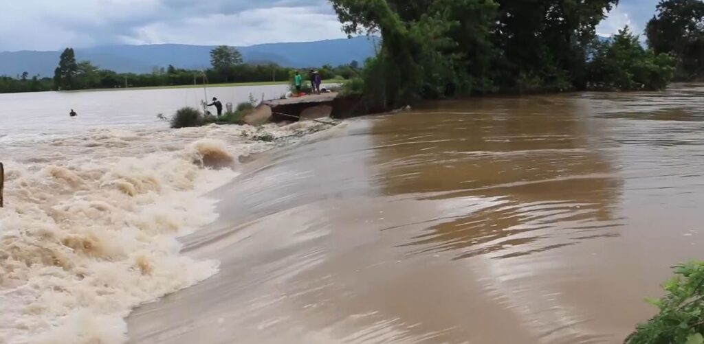 ที่ จ.เพชรบูรณ์ ถนนคอนกรีตเสริมเหล็กริมแม่น้ำป่าสัก เส้นทางเชื่อมต่อระหว่างหมู่ที่ 1 กับหมู่ที่ อ.เมืองเพชรบูรณ์ ถูกกระแสน้ำในแม่น้ำป่าสักกัดเซาะจนขาดเป็นแนวยาวกว่า 10 เมตร ไหลทะลักเข้าท่วมพื้นที่การเกษตร นาข้าวที่กำลังตั้งท้องใกล้จมอยู่ใต้น้ำกว่า 100 ไร่