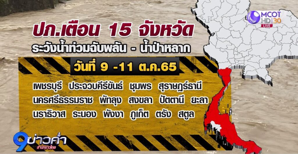 9 ต.ค. – สถานการณ์น้ำท่วมยังน่าห่วง ปริมาณน้ำในลุ่มต่างๆ ยังสูง ล่าสุดมีคำเตือน 15 จังหวัด กลาง-ใต้ ระวังน้ำท่วมฉับพลัน-น้ำป่าไหลหลาก 9-11 ต.ค.นี้ ส่วนทั่วไทยยังมีฝนตกอย่างต่อเนื่อง เหนือ-อีสาน อุณหภูมิเริ่มลด