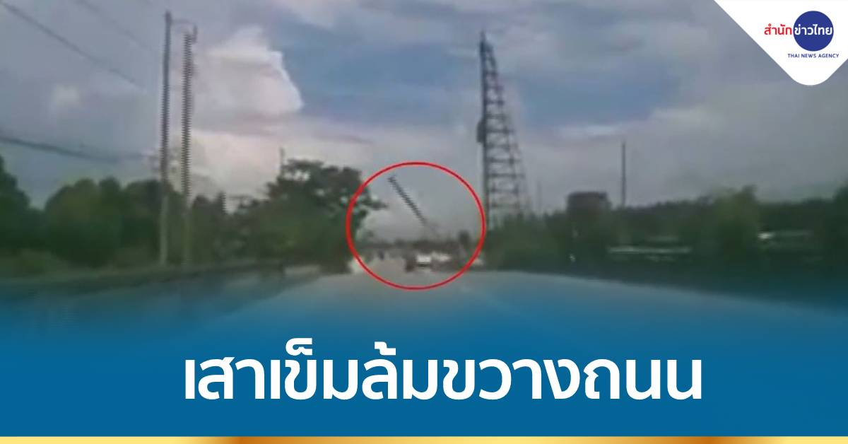ฉะเชิงเทรา 11 ต.ค.- หวิดเกิดเหตุเศร้า เมื่อเสาเข็มก่อสร้างสะพานถนนเลี่ยงเมืองบางขวัญ อ.เมืองฉะเชิงเทรา หลุดจากปั้นจั่นล้มขวางถนน เฉียดรถที่แล่นผ่านมาพอดีไปนิดเดียว