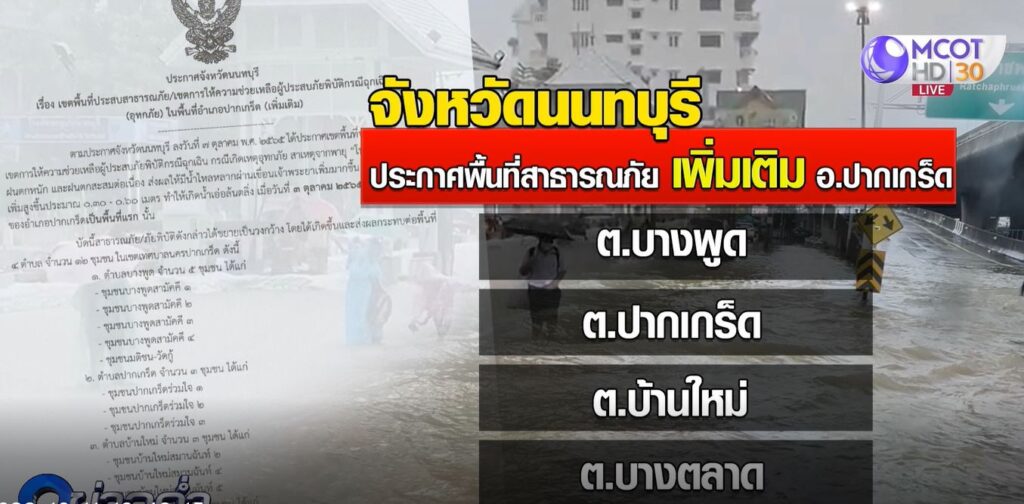 ล่าสุดทาง จ.นนทบุรี ประกาศพื้นที่สาธารณภัยเพิ่มเติมใน อ.ปากเกร็ด อีก 4 ตำบล คือ ต.บางพูด ต.ปากเกร็ด ต.บ้านใหม่ และ ต.บางตลาด