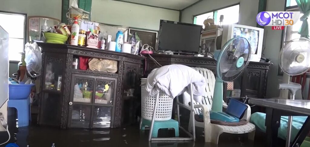 ป้าทิพยา บอกว่าน้ำท่วมบ้านทุกปีแต่ปีนี้ลำบากมากที่สุด เพราะมีผู้ป่วยติดเตียงถึง 2 คน ต้องเดินลุยน้ำในบ้านดูแลทั้ง 2 คนอย่างใกล้ชิด ตอนนี้น้ำท่วมเข้าเดือนที่ 3 แล้ว พื้นบ้านจะมีคราบโคลน คราบตะไคร้ ทำให้พื้นลื่น จึงต้องระมัดระวังมากขึ้น