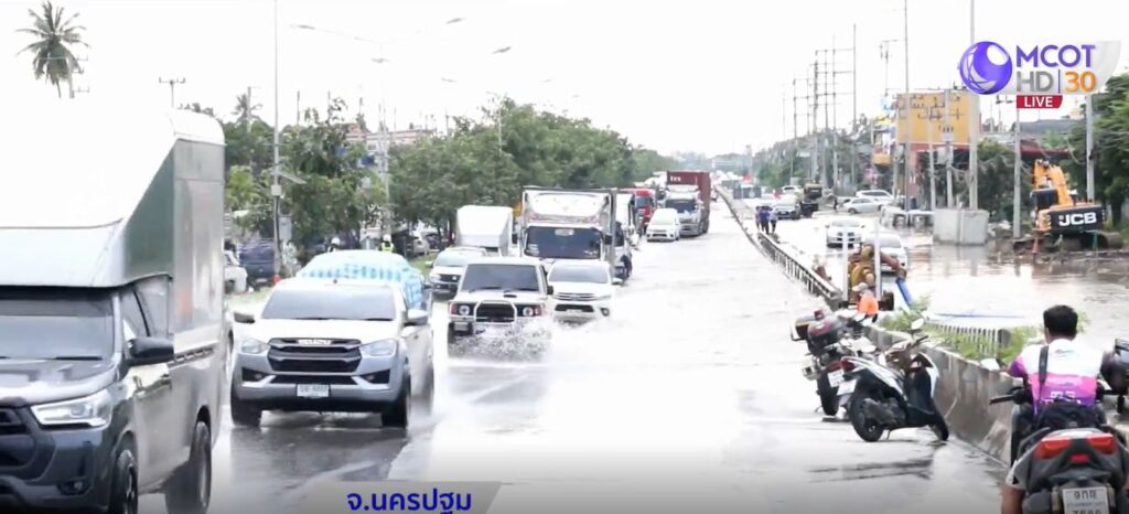 อีกจุดที่เดือดร้อนแล้วเช่นกันคือ ริมแม่น้ำท่าจีน ตอนนี้แม่น้ำท่าจีนเอ่อล้นเข้าท่วมถนนหลานสายใน จ.นครปฐม อย่างที่ถนนบรมราชชนนี ในพื้นที่ อ.สามพราน มีน้ำท่วมสูงกว่า 50 เซนติเมตร ทำให้การจราจรติดขัดยาวกว่า 5 กิโลเมตร