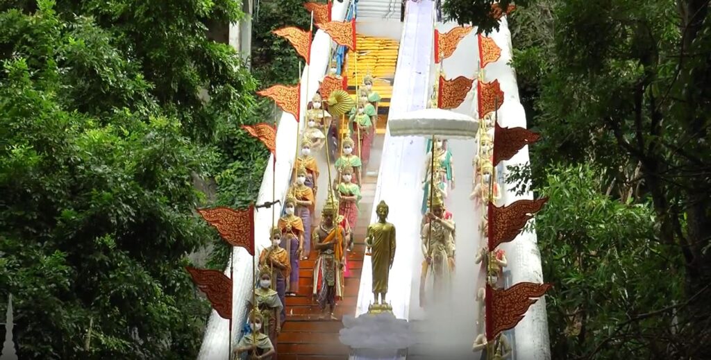 ในพิธีการมีการจำลองการเสด็จลงมาจากสวรรค์ขององค์สัมมาสัมพุทธเจ้าลงมายังโลกมนุษย์ เพื่อโปรดสัตว์และมนุษย์โลก มีนางฟ้านางสวรรค์ เทวดา เสด็จร่วมขบวน พร้อมการฟ้อนรำของประชาชนจาก 13 อำเภอในเพลงรำวงสระบุรี และในระหว่างขบวนแห่ ก็มีชาวบ้านรอใส่บาตรด้วยข้าวต้มลูกโยน ข้าวสาร อาหารแห้ง ผลไม้ แก่พระภิกษุสามเณร.-สำนักข่าวไทย