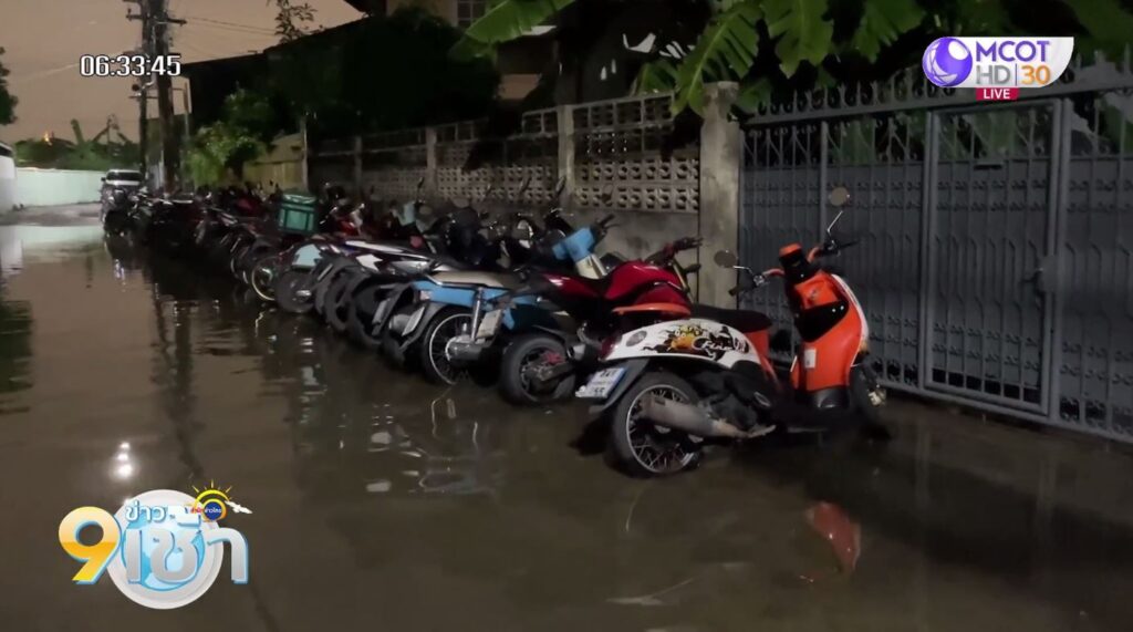 เมื่อคืนที่ผ่านมา ทีมข่าวได้ลงพื้นที่ หมู่บ้านเทพประทาน อ.บางกรวย จ.นนทบุรี โดยบริเวณทางเข้าหมู่บ้านมีรถจักรยานยนต์จอดเรียงรายอยู่เป็นจำนวนมาก ซึ่งเป็นของชาวบ้านที่นำมาจอดไว้ ส่วนรถยนต์จะนำไปจอดไว้บนถนน จากการตรวจสอบพบว่าบริเวณซอย 1-4 ที่อยู่ด้านหน้าของหมู่บ้านไม่ถูกน้ำท่วมขัง บางซอยมีน้ำแค่แฉะๆ พื้นเท่านั้น ที่เหลือตั้งแต่ซอย 6-30 ถูกน้ำท่วมขังแต่ละซอยมีระดับความสูง-ต่ำไม่เท่ากัน บางซอยน้ำสูงกว่า 1 เมตร