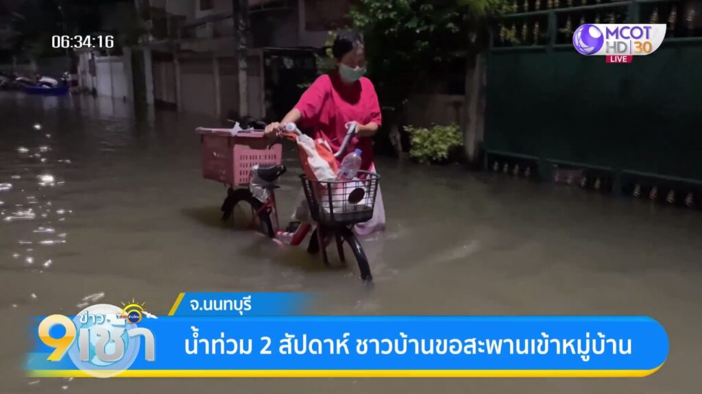 นนทบุรี 12 ต.ค. – ชาวบ้านหมู่บ้านเทพประทาน อ.บางกรวย จ.นนทบุรี เกือบ 400 หลังคาเรือน ต้องเผชิญกับน้ำท่วมขังสูงมานานกว่า 2 สัปดาห์ วอนหน่วยงานที่รับผิดชอบสร้างสะพานทางเดินเข้า-ออก ภายในหมู่บ้านชั่วคราว