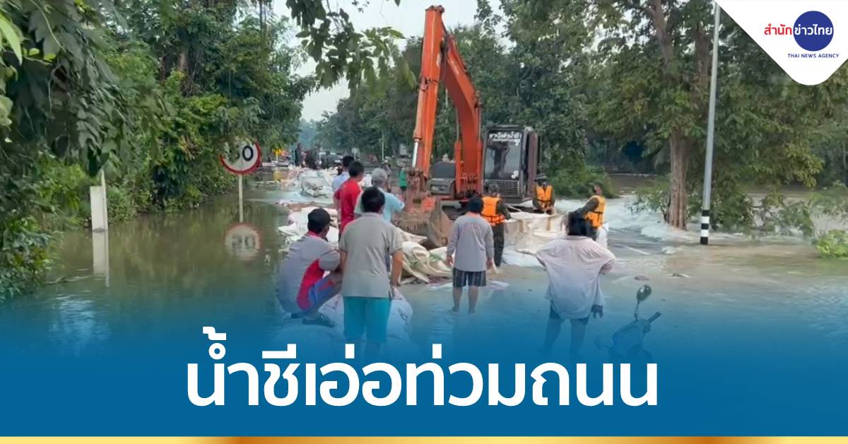 มหาสารคาม, อุบลราชธานี 12 ต.ค.- น้ำชีล้นตลิ่งสูงเกินแนวกั้นไหลย้อนเข้าเขตเทศบาลเมืองมหาสารคาม เข้าท่วมที่ลุ่ม ต.เกิ้ง และถนน 2367 ทางไป อ.กมลาไสย จ.กาฬสินธุ์ ต้องปิดจราจรชั่วคราว เร่งนำบิ๊กแบ็กก่อกำแพงกั้นน้ำ ส่วนที่อุบลราชธานีทุกภาคส่วนร่วมใจช่วยผู้ประสบอุทกภัยต่อเนื่อง