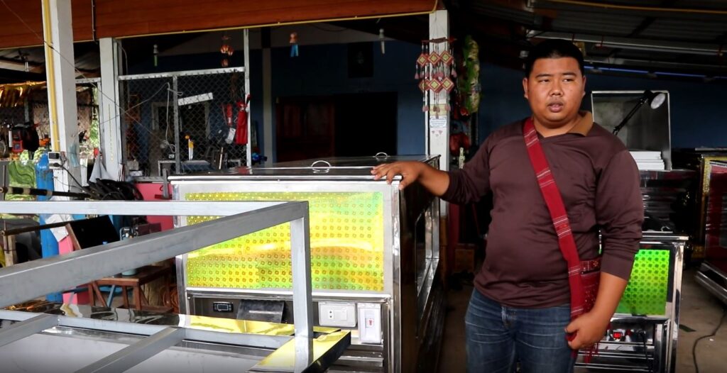 นายชยุตพงศ์ บุญเป้า เจ้าของร้าน เล่าว่า เปิดร้านทำโลงเย็นขายมานานแล้ว กระทั่งไม่นานนี้ มีลูกค้าจากประเทศลาวสั่งทำโลงเย็นที่มีกระจกใส 1 ด้าน เมื่อทำเสร็จ จึงถ่ายคลิปวิดีโอรีวิวโลง เพื่อให้ลูกค้าดู และโพสต์ลงโซเชียล ซึ่งมีผู้เข้ามาชมจำนวนมาก และลูกค้าจากประเทศลาวก็ชื่นชอบโลงดังกล่าว มีการสั่งผลิตและส่งไปจำหน่ายที่ประเทศลาวแล้วนับ 10 โลง โดยลูกค้าชาวลาวบอกว่า ญาติๆ ที่ไปร่วมงานศพจะไปดูหน้าศพ เป็นประเพณีและความเชื่อท้องถิ่น ส่วนในไทยมักใช้กับพระระดับเจ้าอาวาสหรือพระเกจิที่ญาติโยมต้องการให้คณะศิษย์ได้กราบสักการะ