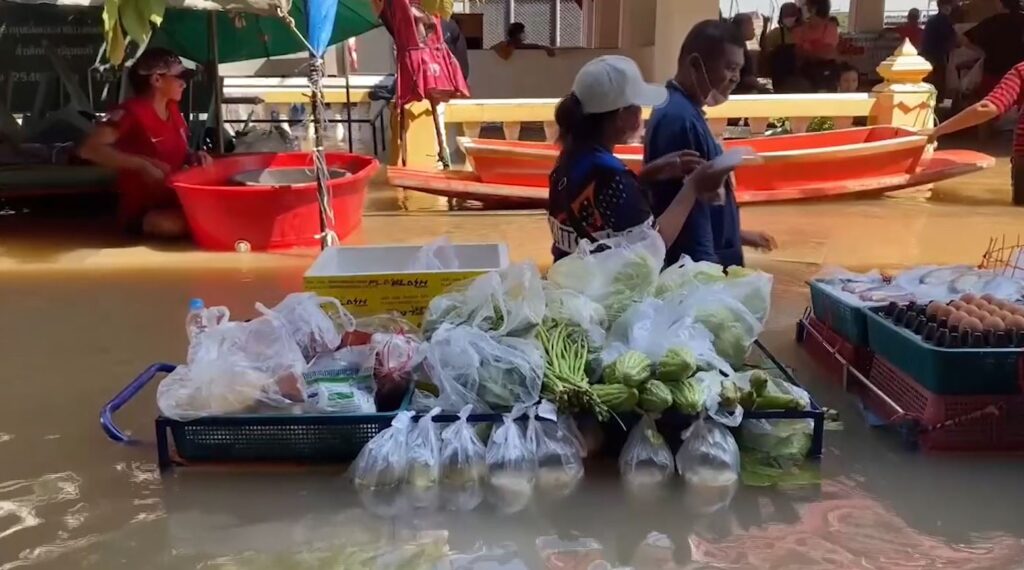 นนทบุรี 14 ต.ค. – แม่ค้าตลาดน้ำเกาะเกร็ด สู้ชีวิตเข็นรถขายกับข้าว-ผักสด ขณะน้ำท่วมเกือบจม