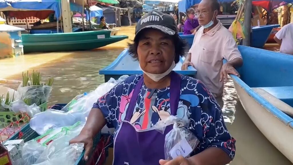 ป้าต้อ เล่าว่า ปกติตนเข็นของขายรอบเกาะเกร็ด แต่ช่วงนี้ไม่สามารถเข็นขายได้เนื่องจากบางพื้นที่เป็นที่ลุ่มต่ำเข็นไปอาจจะทำให้รถจมลงแล้วของได้รับความเสียหาย จึงมาจอดรอน้ำลงที่วัดเสาธงทอง ปรากฏว่าชาวบ้านหลายคนพายเรือสัญจรมาบริเวณนี้ จึงขายของได้เยอะ และก็มีความสุขที่ได้แบ่งปันชาวบ้าน เพราะบางคนไม่สามารถออกไปซื้อกับข้าวได้ ตนยอมรับว่าลำบากมากตอนนี้ รายได้ลดลงเนื่องจากน้ำท่วมสูง แต่ก็ต้องอดทนสู้ เพราะถ้าไม่สู้ก็ไม่มีกิน .-สำนักข่าวไทย