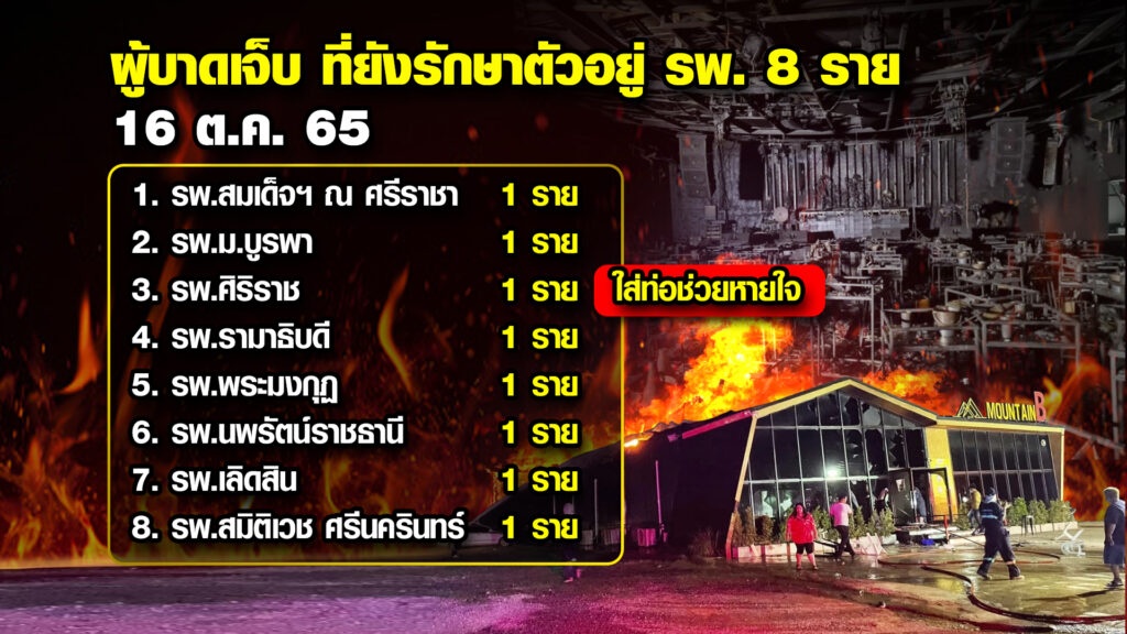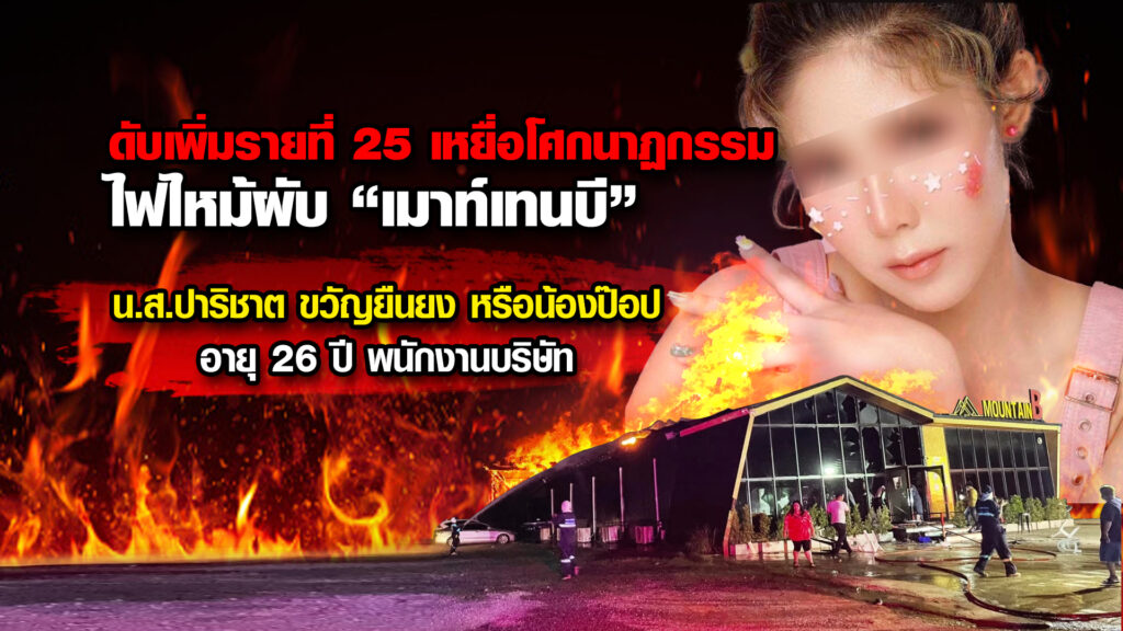 ความคืบหน้าเหตุไฟไหม้ เมาท์เทน บี ผับ อ.สัตหีบ จ.ชลบุรี เมื่อ 5 ส.ค. ที่ผ่านมา ทำให้มีผู้บาดเจ็บและเสียชีวิตจำนวนมาก ล่าสุดเสียชีวิตเพิ่มอีก 1 ราย รวมเป็น 25 ราย ขณะที่ตัวอาคารผับ ถูกรื้อถอนออกจากพื้นที่แล้ว ญาติตั้งคำถามคดียังไม่เสร็จสิ้น รื้อถอนได้หรือไม่