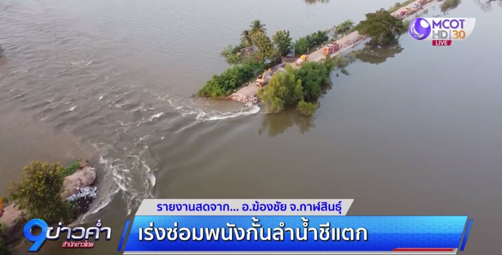 กาฬสินธุ์ 18 ต.ค. – เข้าสู่วันที่ 2 หลังพนังกั้นแม่น้ำชีขาด ที่อำเภอฆ้องชัย จังหวัดกาฬสินธุ์ ส่งผลให้น้ำท่วมหลายหมู่บ้าน ขณะนี้เจ้าหน้าที่กำลังเร่งมือซ่อมแซม โดยจะทำงานตลอด 24 ชั่วโมง เพื่อไม่ให้มวลน้ำขยายวงกว้างมากขึ้น