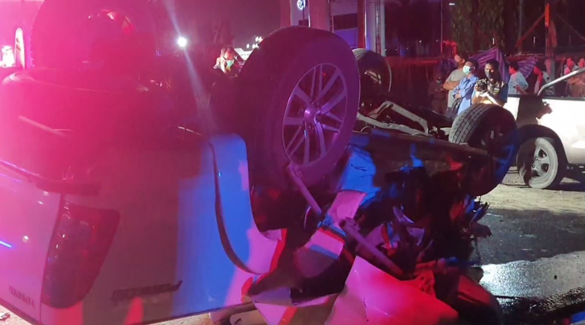 นายสมพงษ์ อายุ 44 ปี รปภ. เล่าว่า ก่อนเกิดเหตุตนเดินมาปิดประตูหน้าบริษัท มองเห็นรถกระบะสีขาวคันดังกล่าววิ่งอยู่ในช่องเลนกลางด้วยความเร็วและมาคันเดียว พอตนหันหลังก็ได้ยินเสียงดังสนั่น คาดว่ารถอาจเสียหลัก หรือคนขับหลับใน รถแฉลบเข้าข้างทางด้านซ้าย และเฉี่ยวชนรถที่จอดอยู่ริมถนน 3 คัน ก่อนที่รถกระบะจะพลิกคว่ำขวางถนน ตนจึงรีบวิ่งมาดู พบว่าคนขับถูกตัวรถทับร่างไว้ จึงรีบโทรศัพท์แจ้งตำรวจและกู้ภัยมาที่เกิดเหตุ