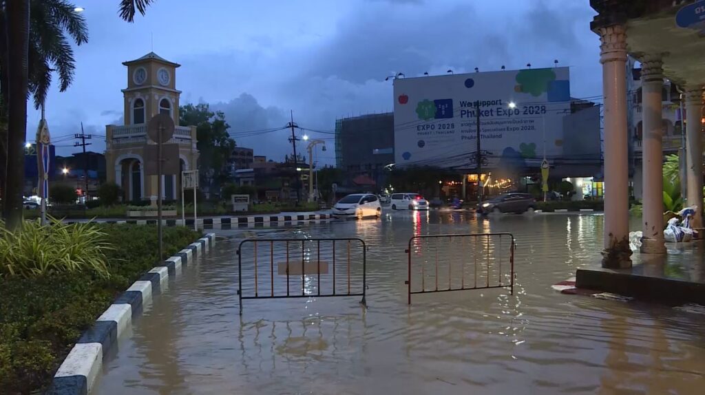 ที่จังหวัดภูเก็ตตลอดทั้งวันทั้งคืนที่ผ่านมา มีฝนตกกระหน่ำอย่างต่อเนื่องส่งผลทำให้ปริมาณน้ำฝนเพิ่มขึ้นอย่างรวดเร็ว โดยเฉพาะปริมาณน้ำในคลองบางใหญ่ซึ่งเป็นพื้นที่ท้ายน้ำก่อนระบายออกสู่ทะเลสูงจนเออล้นตลิ่งเข้าท่วมบ้านเรือนและร้านค้าของประชาชนในพื้นที่ย่านเมืองเก่าภูเก็ต ในหลายจุด อาทิ บริเวณแยกธนาคารชาร์เตอร์ หน้าไปรษณีย์ไทยภูเก็ต บริเวณวงเวียนหอนาฬิกา บางจุดเจ้าหน้าที่ต้องปิดกั้นเส้นทางห้ามรถผ่านเข้าออกอย่าง เช่น บริเวณถนนดีบุก ซึ่งระดับน้ำเพิ่มสูงขึ้นเรื่อยๆ ส่วนบางจุดที่ยังไม่มีการปิดเส้นทางแม้ว่าจะมีน้ำท่วมผิวจราจร แต่ก็ทำให้รถที่ผ่านเคลื่อนตัวไปได้อย่างช้าๆ เพราะมีน้ำท่วมขังเต็มพื้นถนนแล้ว โดยเทศบาลนครนครภูเก็ต ได้ประชาสัมพันธ์ให้ประชาชนและผู้ประกอบการเก็บย้ายสิ่งของขึ้นสู่ที่สูงเพื่อรับสถานการณ์ รวมถึงแจกจ่ายกระสอบทรายให้กับประชาชน