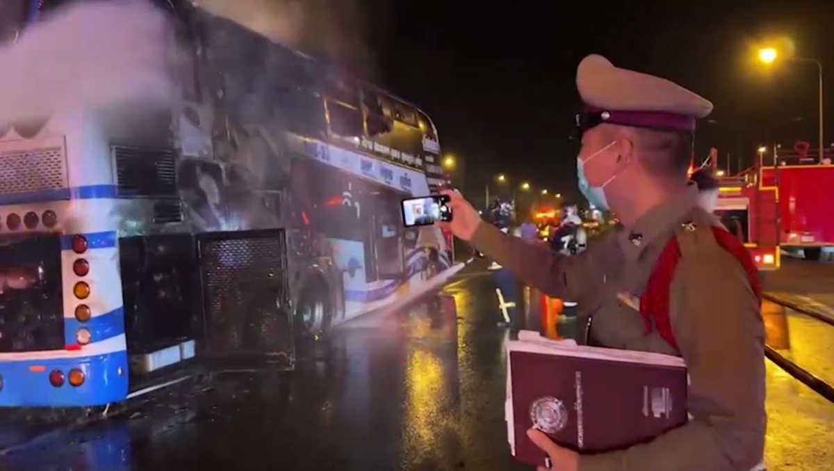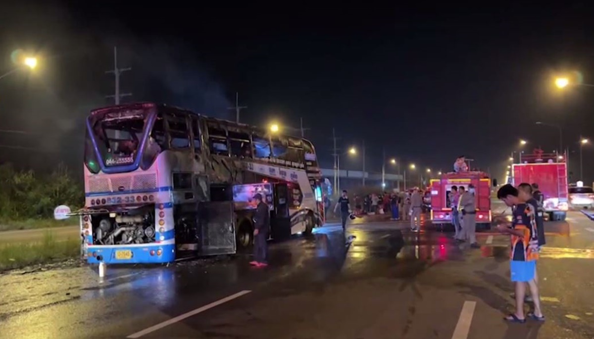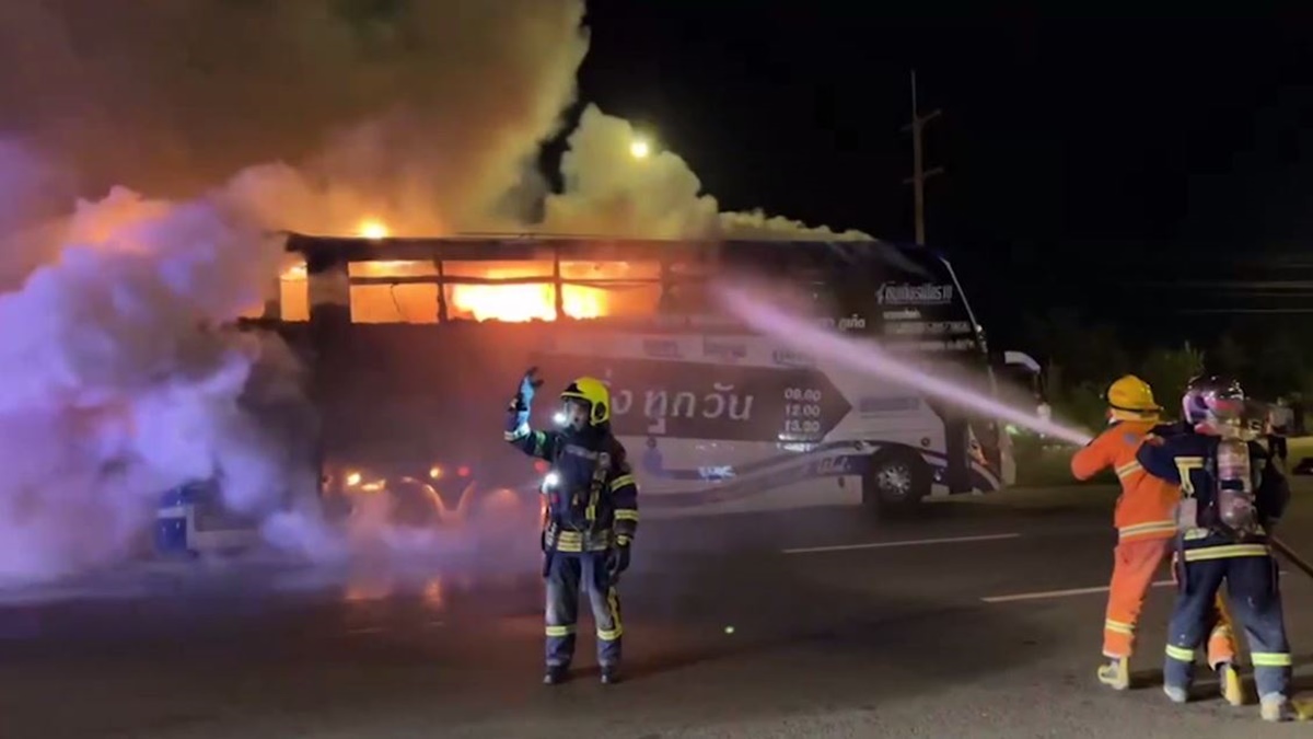 สอบสวนเบื้องต้นทราบว่า รถทัวร์คันดังกล่าว มีคนขับรถ 1 คน และเด็กรถอีก 1 คน รับผู้โดยสาร 21 คน จาก จ.อุบลราชธานี มุ่งหน้า จ.ภูเก็ต เมื่อมาถึงที่เกิดเหตุ ยางล้อหลังด้านขวาระเบิด จนเกิดประกายไฟใต้ท้องรถ และทำให้เกิดไฟลุกไหม้ลามทั้งคัน โชคดีที่ตอนเริ่มเกิดเหตุ คนขับจอดรถและผู้โดยสารทั้งหมดได้ลงจากรถ จึงปลอดภัยทุกคน ส่วนซากรถทัวร์ที่ถูกไฟไหม้ รอเจ้าหน้าที่พิสูจน์หลักฐานมาตรวจสอบ เพื่อหาสาเหตุต่อไป. – สำนักข่าวไทย