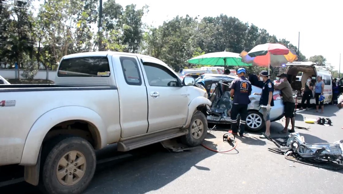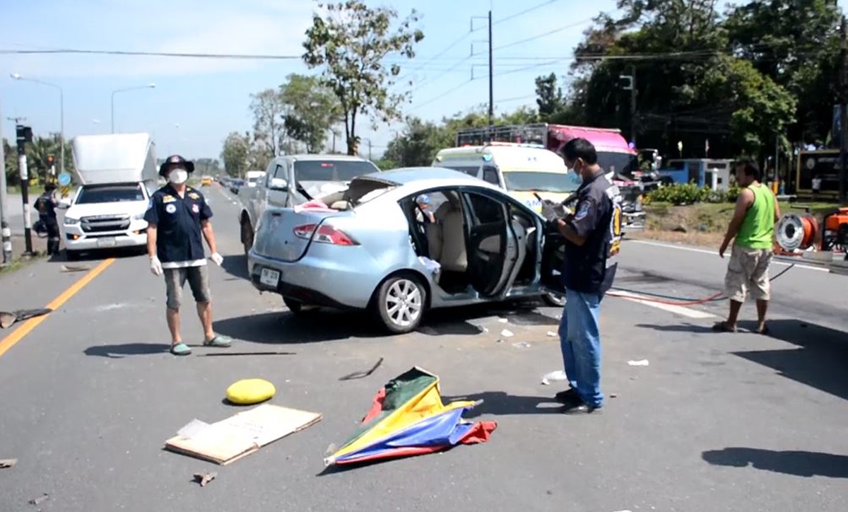 ตรวจสอบที่เกิดเหตุ พบรถเก๋งมาสด้า สีฟ้า ทะเบียนจันทบุรี ลักษณะเสียหลักจอดขวางช่องจราจรฝั่งขวา หลังถูกรถกระบะวีโก้ สีบรอนซ์ ทะเบียนจันทบุรี คู่กรณี พุ่งชนเข้ากลางลำ เสียหายยับ ภายในซากรถเก๋งพบร่างผู้บาดเจ็บ 2 ราย ติดอยู่ ส่วนอีก 3 ราย รวมคนขับรถกระบะ กู้ภัยให้การช่วยเหลือนำส่งโรงพยาบาลไปก่อนแล้ว