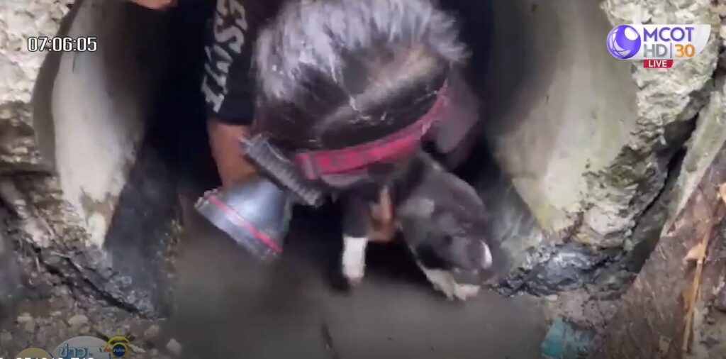 พอไปถึงกู้ภัยได้ยินเสียงลูกสุนัขร้องอยู่ในท่อระบายน้ำ เนื่องจากฝาปิดท่อคอนกรีตมีรอยชำรุดแตกหัก จึงวางแผนให้กู้ภัยที่ตัวผอมเล็กมุดท่อ โดยใช้เชือกมัดเอวแล้วค่อยๆ คลานลงไปตามท่อที่มีขนาดเส้นผ่าศูนย์กลาง 70 เซนติเมตร และต้องเปิดฝาท่อระบายน้ำสกัดดักหน้าเอาไว้ เพื่อไม่ให้ลูกสุนัขที่กำลังตกใจหนีเตลิด ใช้เวลา 30 นาที จึงสามารถคว้าลูกสุนัขสีดำจำนวน 2 ตัว ขึ้นมาจากท่อระบายน้ำ ทำเอาชาวบ้านโล่งใจ เพราะปลอดภัยทั้งคนและลูกสุนัข