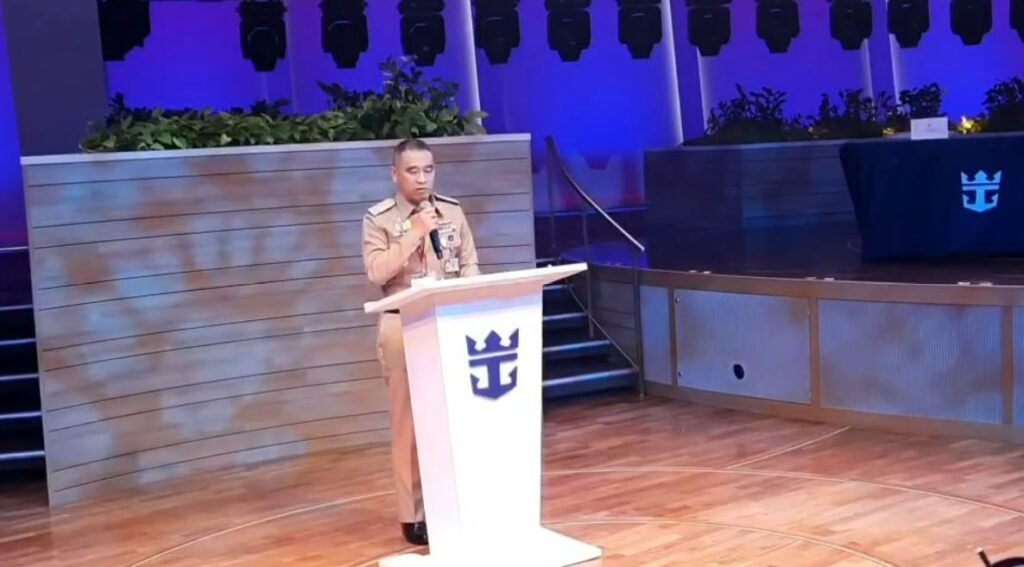 “ในฐานะเจ้าของบ้าน ผมขอถือโอกาสนี้ในการต้อนรับการกลับมาให้บริการในประเทศไทยของสายเรือ Royal Caribbean International อีกครั้ง และมีความยินดีที่จะสนับสนุนและอำนวยความสะดวกให้กับ เรือสำราญและนักท่องเที่ยวทุกๆ คน ขอบคุณครับ” รอง ผอ.ศรชล. กล่าว
