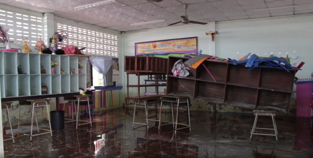 คุณครูเล่าว่า น้ำเริ่มหลากเข้าท่วมภายในบริเวณโรงเรียนตั้งแต่วันที่ 2 ตุลาคมที่ผ่านมา ซึ่งเป็นช่วงที่กำลังจะสอบปลายภาค ทำให้ต้องปิดเรียนชั่วคราวและเลื่อนสอบปลายภาคออกไปโดยไม่มีกำหนด ตอนนี้น้ำเริ่มลดลง โรงเรียนจะกลับมาเปิดสอนอีกครั้งในวันที่ 7 พฤศจิกายนนี้ แต่จะยังไม่จัดสอบปลายภาคในทันที เนื่องจากต้องให้นักเรียนได้ปรับตัวก่อนสักระยะ โดยหลังสอบเสร็จโรงเรียนจะมีการสอบชดเชยให้นักเรียนด้วย เพื่อเติมเต็มความรู้ในช่วงที่ปิดเรียนชั่วคราวไป