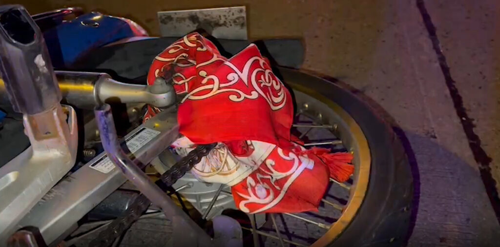 สอบถามนายกฤตฏิมาศักดิ์ เจริญสุข อายุ 24 ปีเพื่อนผู้เสียชีวิตที่เป็นคนขี่รถจักรยานยนต์ กล่าวว่า ผู้เสียชีวิตได้ไปสังสรรค์กับกลุ่มเพื่อนและได้โทรศัพท์มาขอให้ตนขี่รถไปรับบริเวณสายใต้ใหม่ เพื่อให้มาส่งย่าน อ.บางใหญ่ โดยมีตนเป็นคนขี่ ผู้เสียชีวิตนั่งด้านหน้าตน และมีเพื่อนหญิงอีกคนซ้อนท้าย รวม 3 คนในขณะที่ขี่ล้อหลังเหมือนล็อก รถจึงเสียล้มลงทันที หลังเกิดเหตุจึงมาทราบภายหลังว่าผ้าสีแดงซึ่งเป็นผ้าคลุมที่ผู้เสียชีวิตถือไว้ พันเข้าไปอยู่ในล้อหลังทำให้ล้อหลังเกิดล็อกไม่หมุน