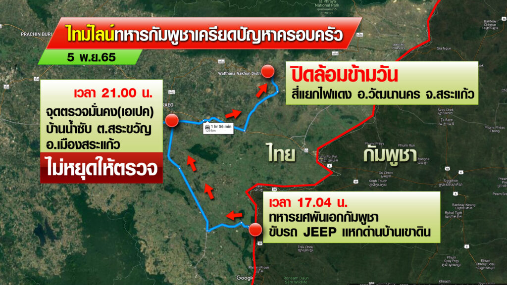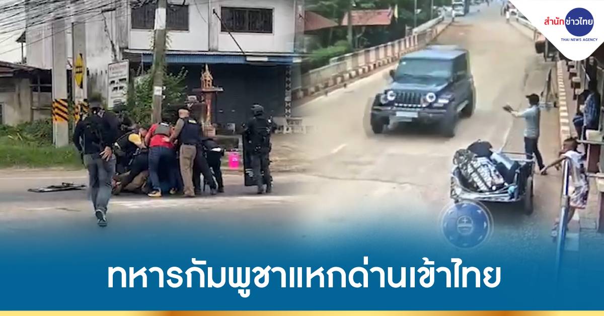 เหตุเกิดเวลาประมาณ 17.04 น. เมื่อวานนี้ ตำรวจ ตม.จว.สระแก้ว ประจำด่านผ่านแดนถาวรบ้านเขาดิน อ.คลองหาด จ.สระแก้ว แจ้งว่ามีรถ JEEP รุ่น Wrangler ทะเบียนทหารกัมพูชา PICH.NIK บนฝากระโปรงรถติดตราสัญลักษณ์ทหารกัมพูชา ขับแหกด่านจากฝั่งกัมพูชาเข้ามาในไทย มุ่งหน้าไปทาง อ.วัฒนานคร จ.สระแก้ว จึงออกติดตามไล่ล่ามาจนถึงบริเวณสี่แยกไฟแดง อ.วัฒนานคร จ.สระแก้ว จึงนำกำลังเขาปิดล้อม แต่ผู้ขับขี่ไม่ยอมลงมาจากรถ ทำให้ต้องปิดล้อมนานข้ามคืน