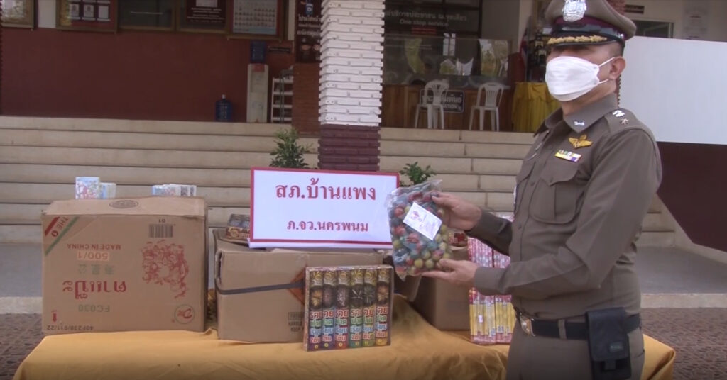 ขณะที่ พล.ต.ต.ธวัชชัย ถุงเป้า ผู้บังคับการตำรวจภูธรจังหวัดนครพนม สั่งการให้ตำรวจทุกท้องที่ทั้ง 12 อำเภอ ร่วมกับหน่วยงานเกี่ยวข้อง ลงพื้นที่ตรวจสอบกวาดล้างปราบปรามจับกุมป้องกันการลักลอบขายประทัดดอกไม้ไฟที่เสี่ยงเกิดอันตรายในช่วงเทศกาลงานลอยกระทง ยาวไปถึงปีใหม่ หากพบกระทำผิดลักลอบจำหน่าย จะมีการจับกุมดำเนินคดีขั้นเด็ดขาด