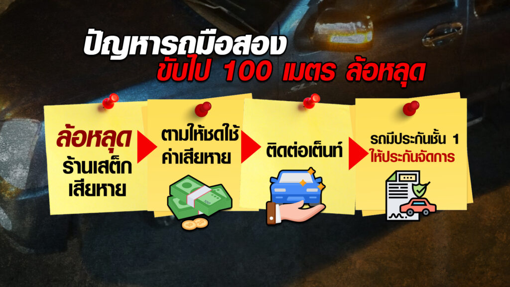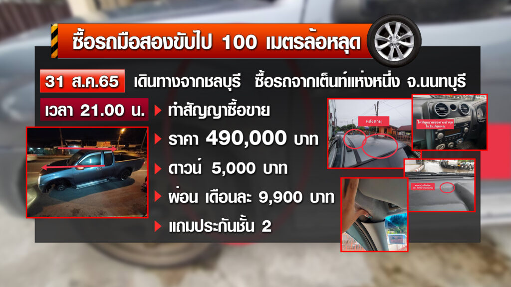 นนทบุรี 7 พ.ย. – สาวซื้อรถมือสองจากเต็นท์ ขับออกไปไม่ถึง 100 เมตร ล้อหลุดชนร้านสเต็กริมทางเสียหาย เต็นท์อ้างยกเลิกสัญญาไม่ได้ ตรวจสภาพพบรถพังยกคัน คัสซีคดเหมือนผ่านการชนมาอย่างหนัก ล้อทั้ง 4 ไร้นอตยึด