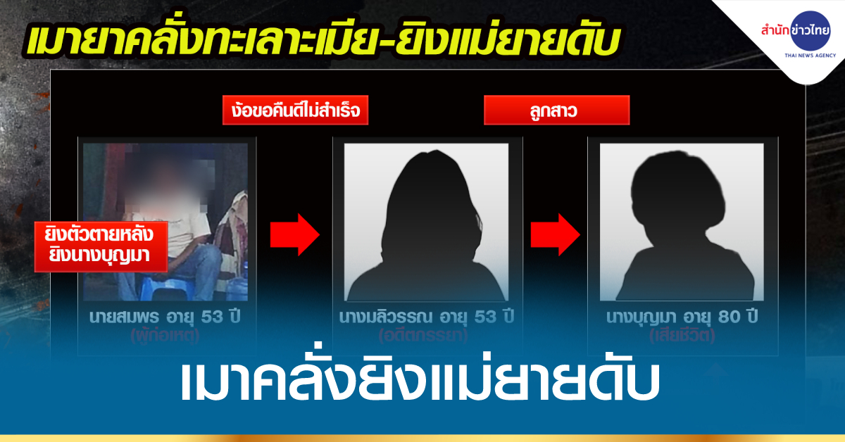 นางมลิวรรณ อายุ 53 ปี ร่ำไห้โดยมีญาติๆ คอยปลอบขวัญ เนื่องจากอดีตสามี คือ นายสมพร อายุ 53 ปี ก่อเหตุยิงแม่ของตนเอง หรือแม่ยาย คือ นางบุญมา อายุ 80 ปี จนเสียชีวิต ตนเองจึงรีบวิ่งหนีออกมาจากบ้าน ส่วนผู้ก่อเหตุยังอยู่ภายในบ้าน